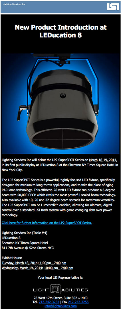 Lighting Services Inc will debut the LP2 SuperSPOT Series on March 18-19, 2014, in its first public display at LEDucation 8 at the Sheraton NY Times Square Hotel in New York City.