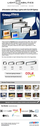 Cole Lighting’s LED Steplites are equipped with high performance modules and integral drivers. They can be modified to fit almost any interior or exterior application.