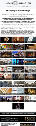 Lighting is the most cost-effective change you can make to enhance a building…maybe you need to update a Zombie…Let us Help!