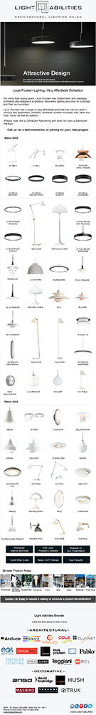 Louis Poulsen's Very Affordable, Attractive Design August 15h, 2018VIEW EMAILLouis Poulsen has a range of very affordable products that can be used in virtually any application, pendant, recessed, surface mounted, wall, table and floor, indoor as well as outdoor. Post navigationPreviousPrevious post:Pablo Affordable LED CollectionNextNext post:LSI’s LED Mini Framing Projector & Control Track