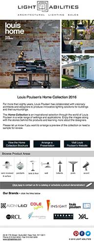 Home Collection 2016 Email campaign: January 13th, 2016VIEW EMAILThe Home Collection is an inspirational selection through the world of Louis Poulsen in a wide range of settings and applications. Enjoy the brochure images along with the stories behind the products and learning more about the designers. Post navigationPreviousPrevious post:Happy Holidays 2015NextNext post:Insight Lighting’s LED Collection