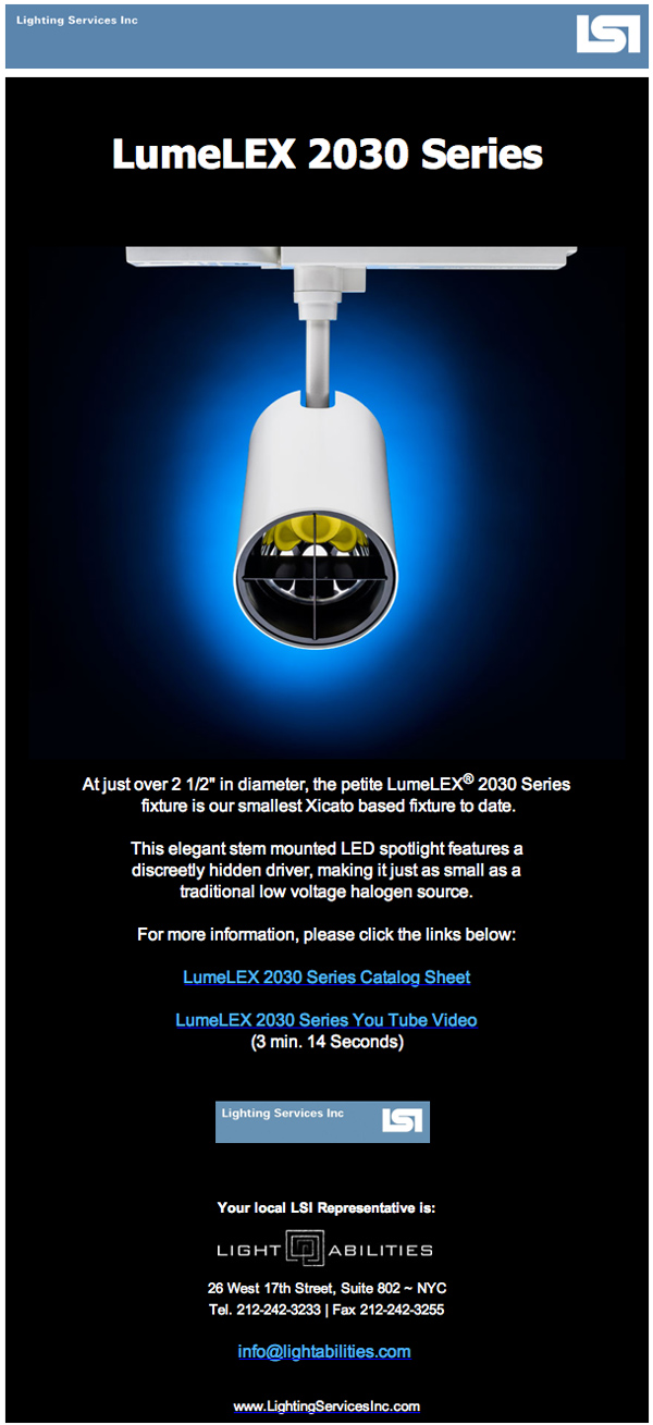 Introducing LumeLEX 2030 Series Email campaign: May 1st, 2012Lighting Services Inc’s smallest Xicato based fixture to dateThis elegant stem mounted LED spotlight features a discreetly hidden driver, making it just as small as a traditional low voltage halogen source. Post navigationPreviousPrevious post:Louis Poulsen’s LC ShuttersNextNext post:Louis Poulsen’s Pendant Mailer