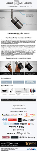 Evo Zoom 16 is lockable in pan and tilt, and accepts multiple accessories including lenses, louvres, and snoots. It is compatible with all of Precision Lighting’s existing track and monopoint systems and is available in a wide range of standard and custom finishes.