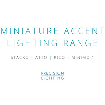 The Precision Lighting miniature accent lighting range consists of 4 product families (Stacko, Atto, Pico, Minimo) providing a mixture of recessed, surface mounted and minipoint mounting options.